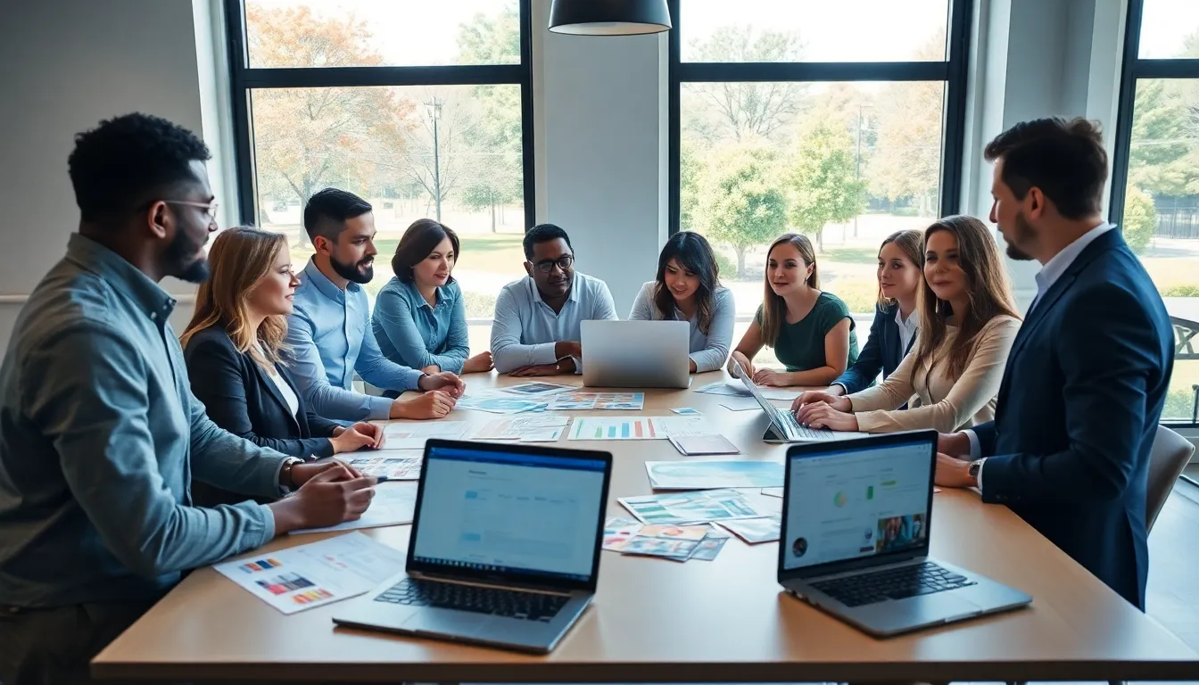 diverse group collaborating on creative event planning in a modern space.
